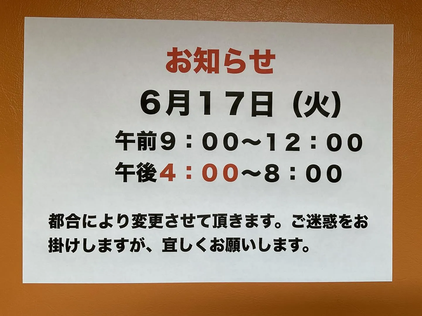 6月17日(火)午前は通常通り9:00〜12:00ですが、午後は4:00〜8:00と午後が通常より1時間遅く始まります🙇